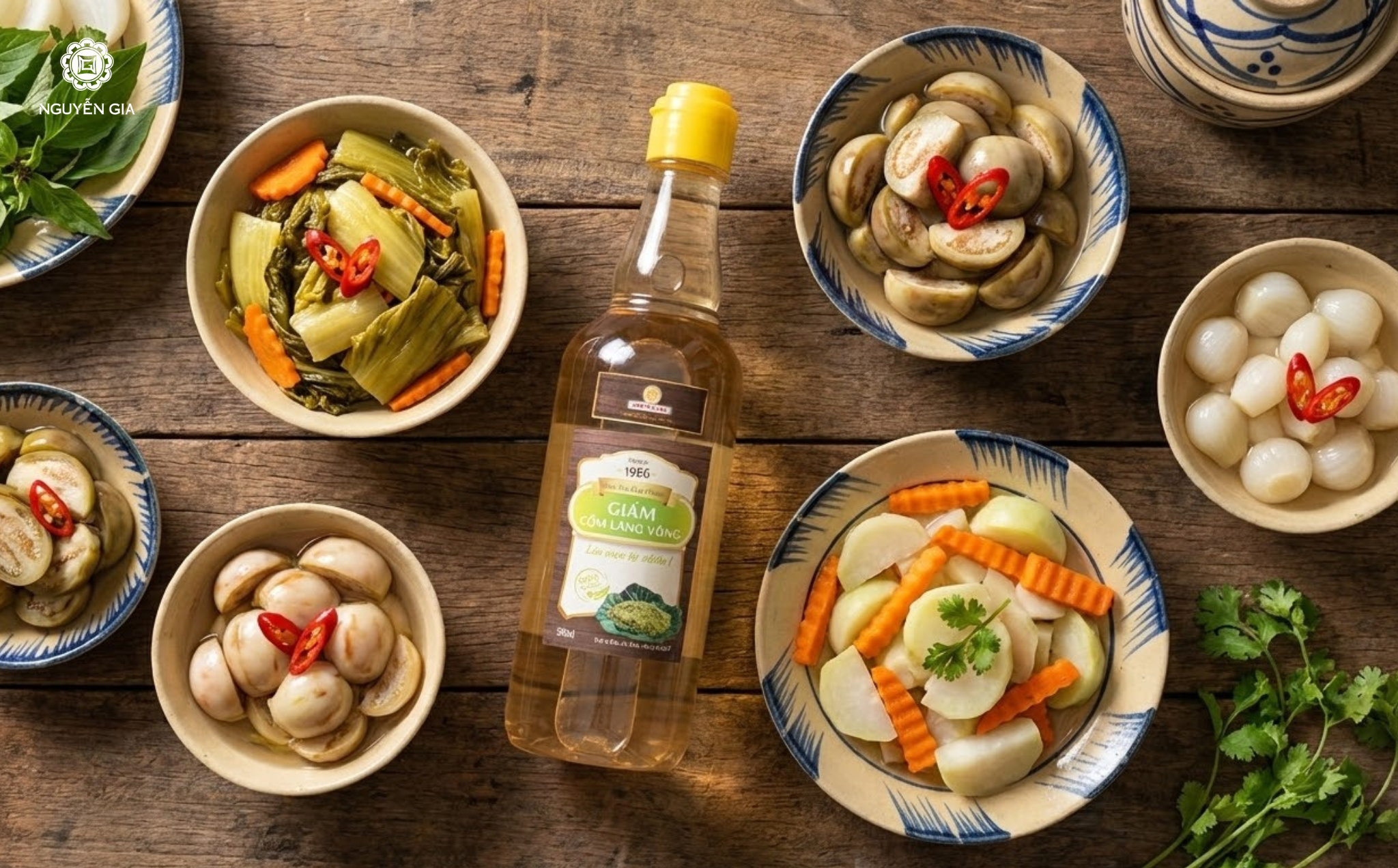• Xếp các nguyên liệu vào hũ, đổ nước giấm vào, thêm rau thơm vào cuối cùng. Để 1-2 ngày trước khi ăn.